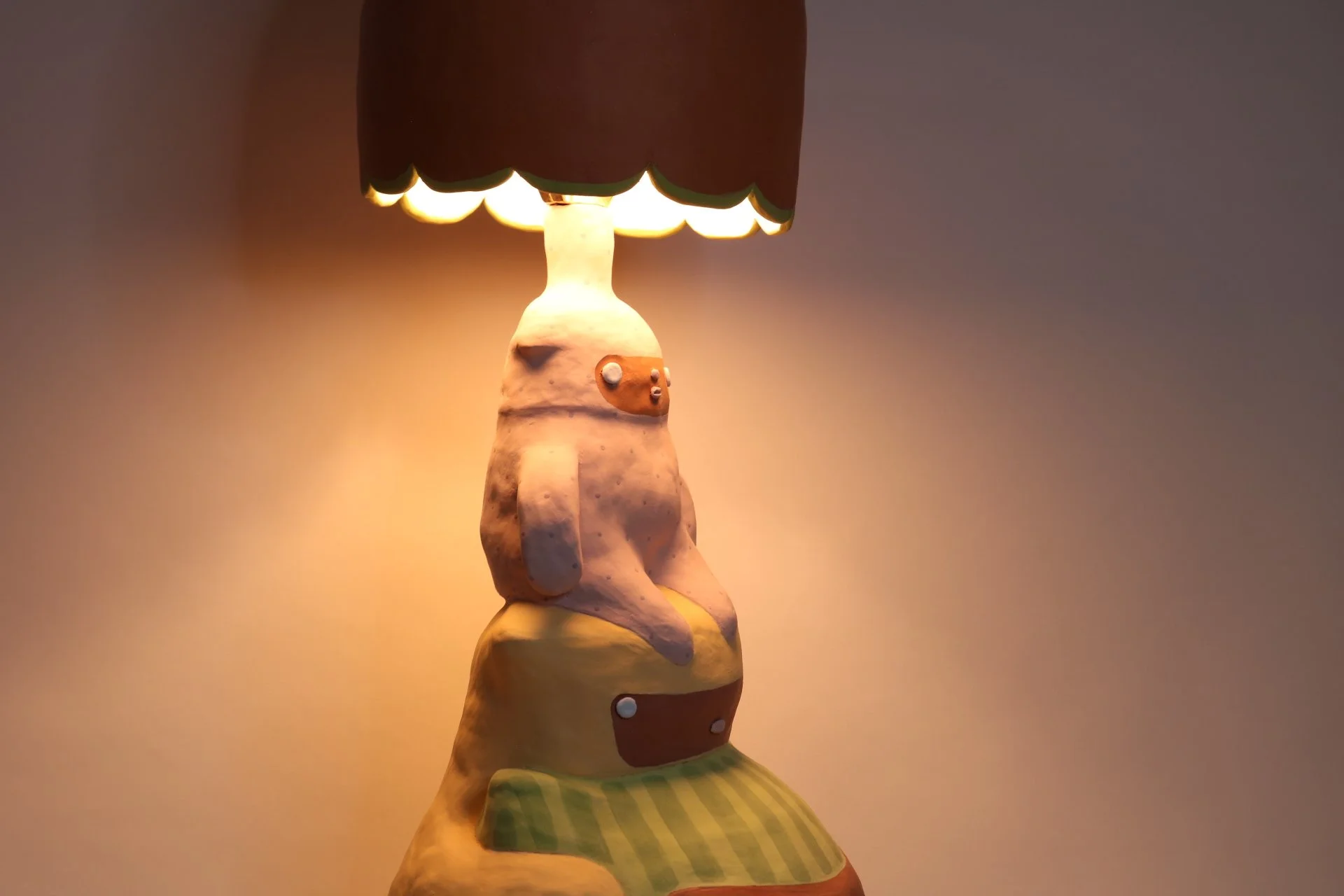 This lamp is the first of an on going series of hand-built ceramic functional objects made with Brooklyn red clay and hand painted with underglaze. Curves, softened edges and a muted palette of pastel colors give this design a warm feeling. This series is about creating a safe, imaginative space for a kid’s room with friendly faces that can help ward off the monsters under the bed.
